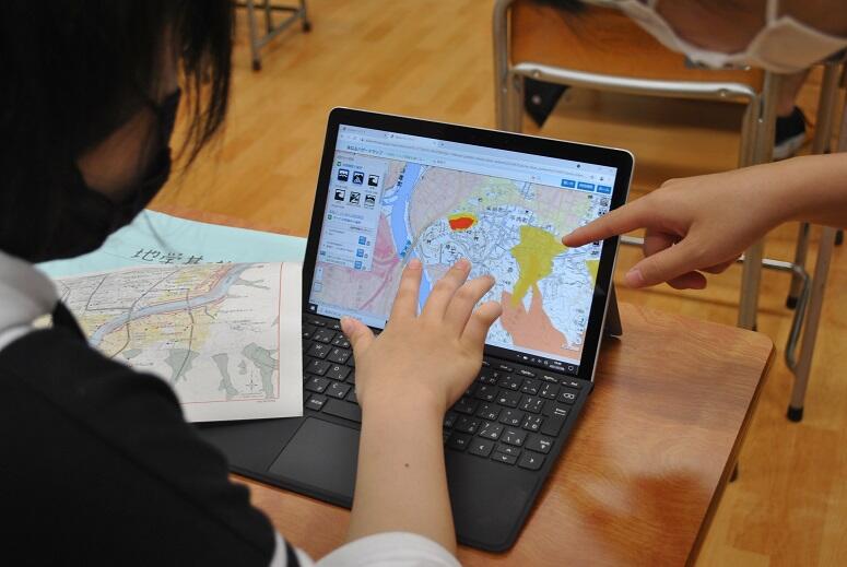 生徒たちは、タブレットPCを活用し、自分が住む地域のハザードマップを確認しました。